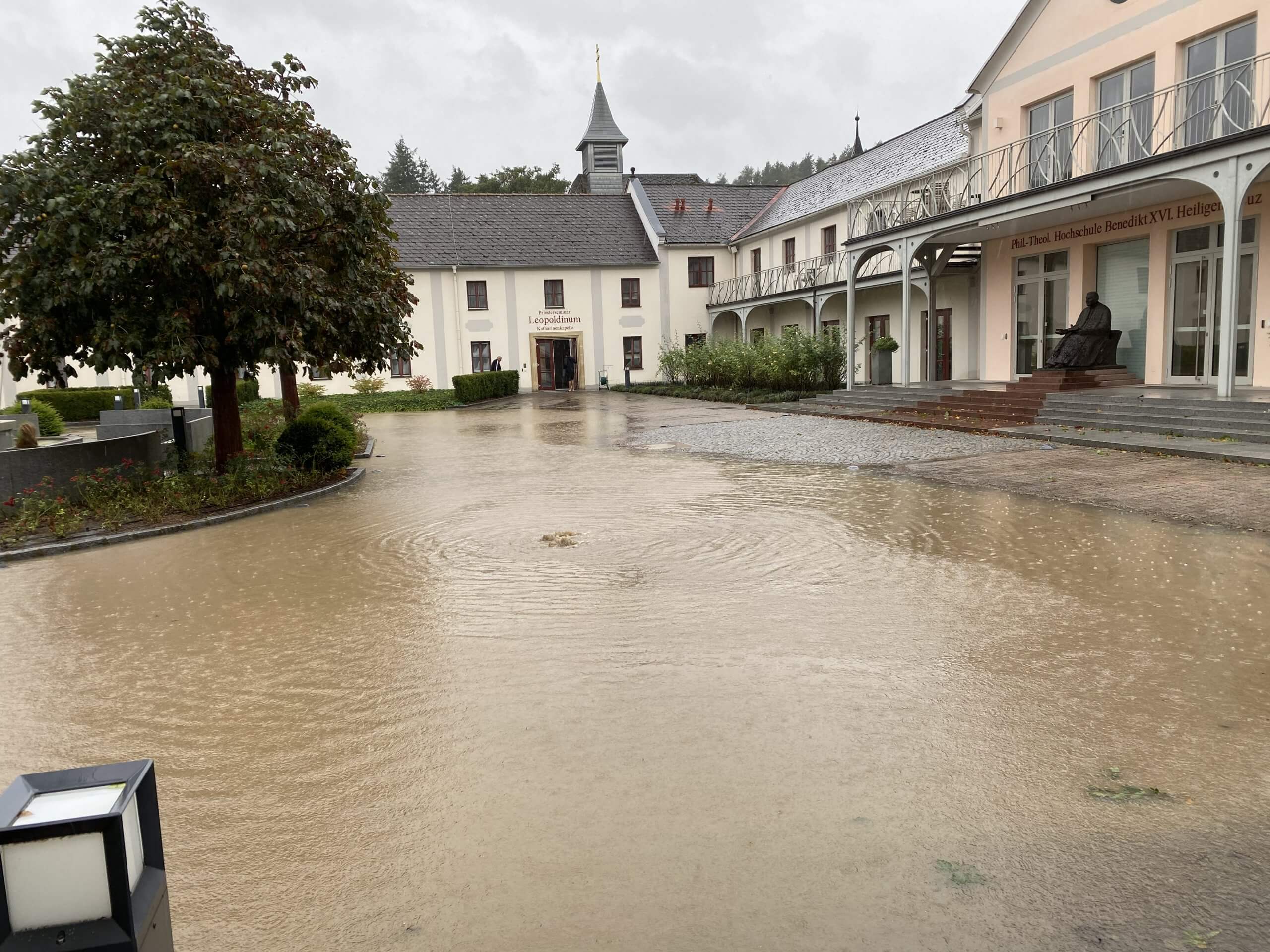 Das Hochwasser, das ganz Österreich in diesen Tagen heimsucht, hat auch die Hochschule, das Priesterseminar Leopoldinum, das Janos-Brenner-Studentenheim und die Katharinenkapelle sehr stark getroffen. Die Montagsmesse wird in den kommenden Wochen aus der Kreuzkirche übertragen werden, da die Katharinenkapelle nicht nutzbar ist. Besonders im Leopoldinum sind große Schäden entstanden: das Haus stand eine Zeit lang komplett unter Wasser. Gott sei Dank sind keine Personen zu Schaden gekommen. Da kommt in den kommenden Wochen viel auf uns zu. Danke allen für die Verbundenheit!
